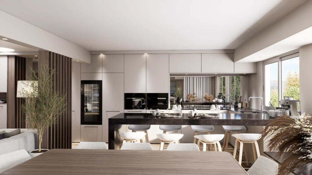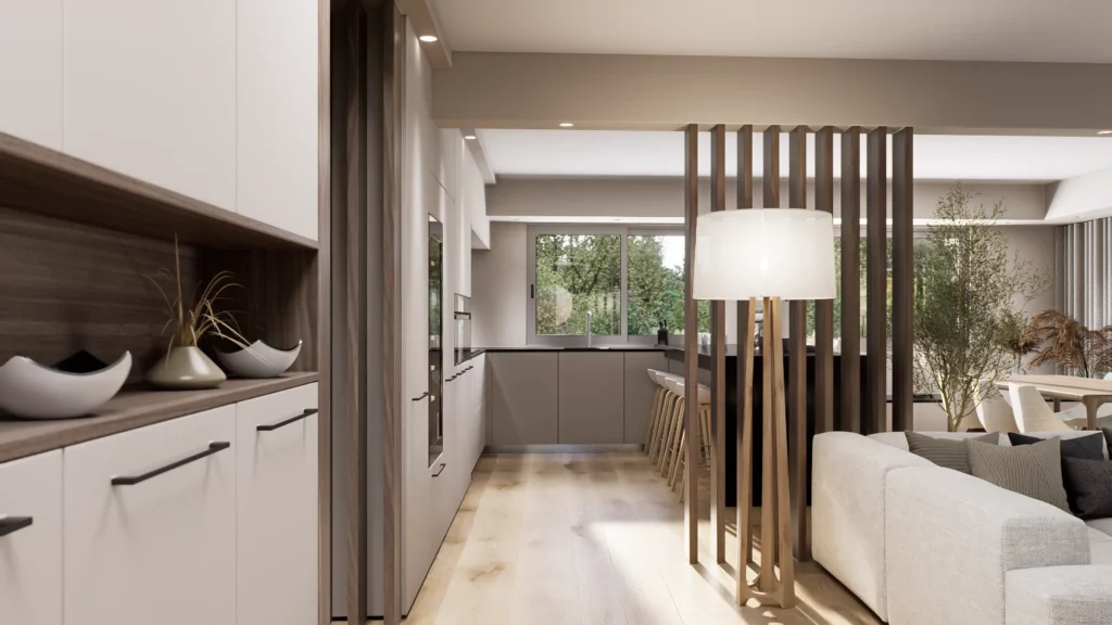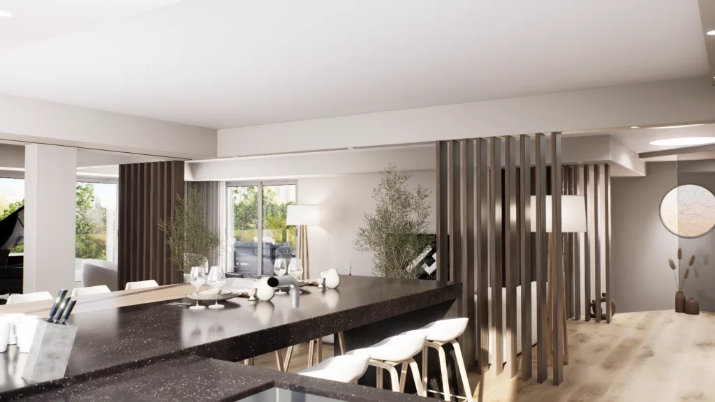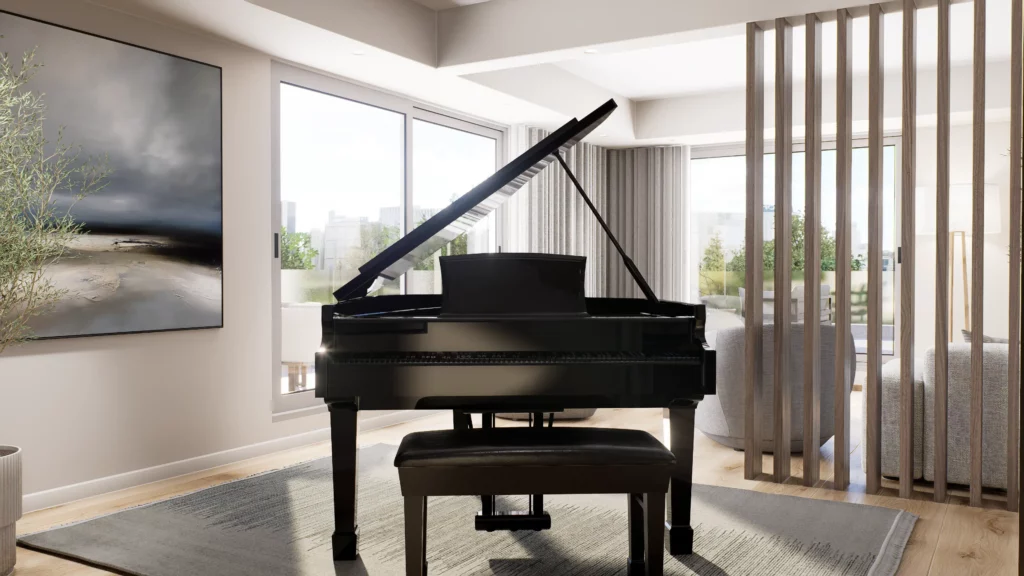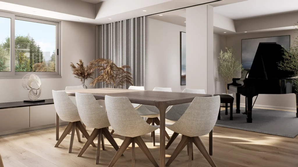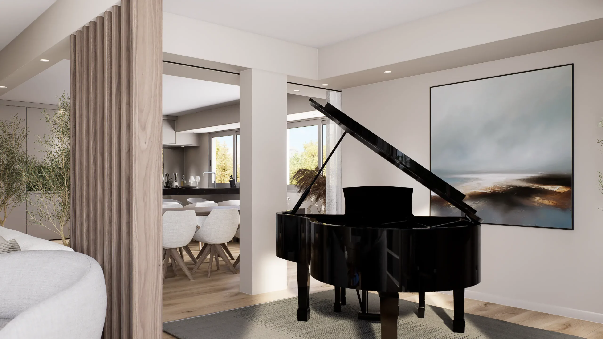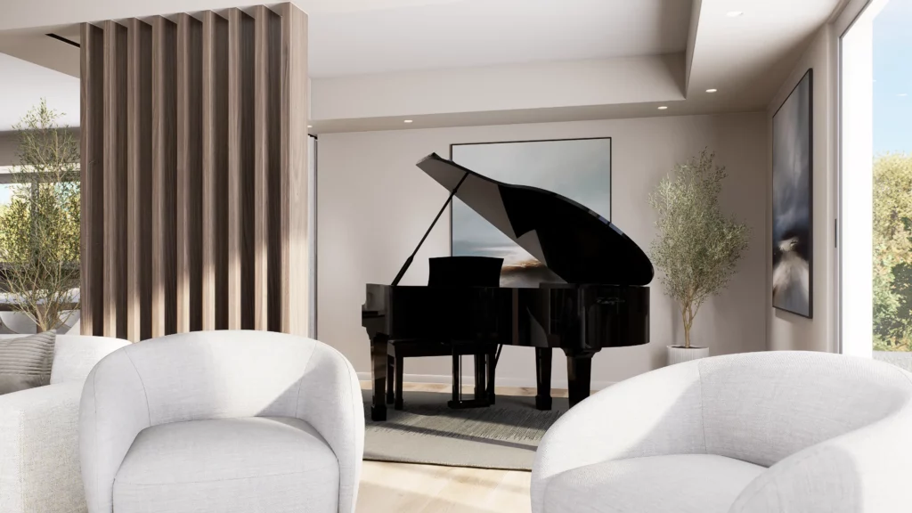 La pièce de vie, cœur du projet, s’organise autour de l’intégration d’un piano, élément central de la décoration et de la convivialité de l’espace. L’ambiance contemporaine se marie avec des touches boisées, apportant chaleur et équilibre à l’ensemble. Cuisine, salle à manger et salon dialoguent dans une continuité fluide, pensée pour la fonctionnalité autant que pour l’esthétique.