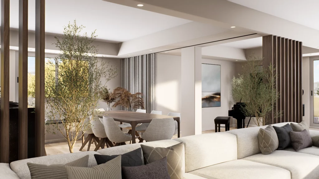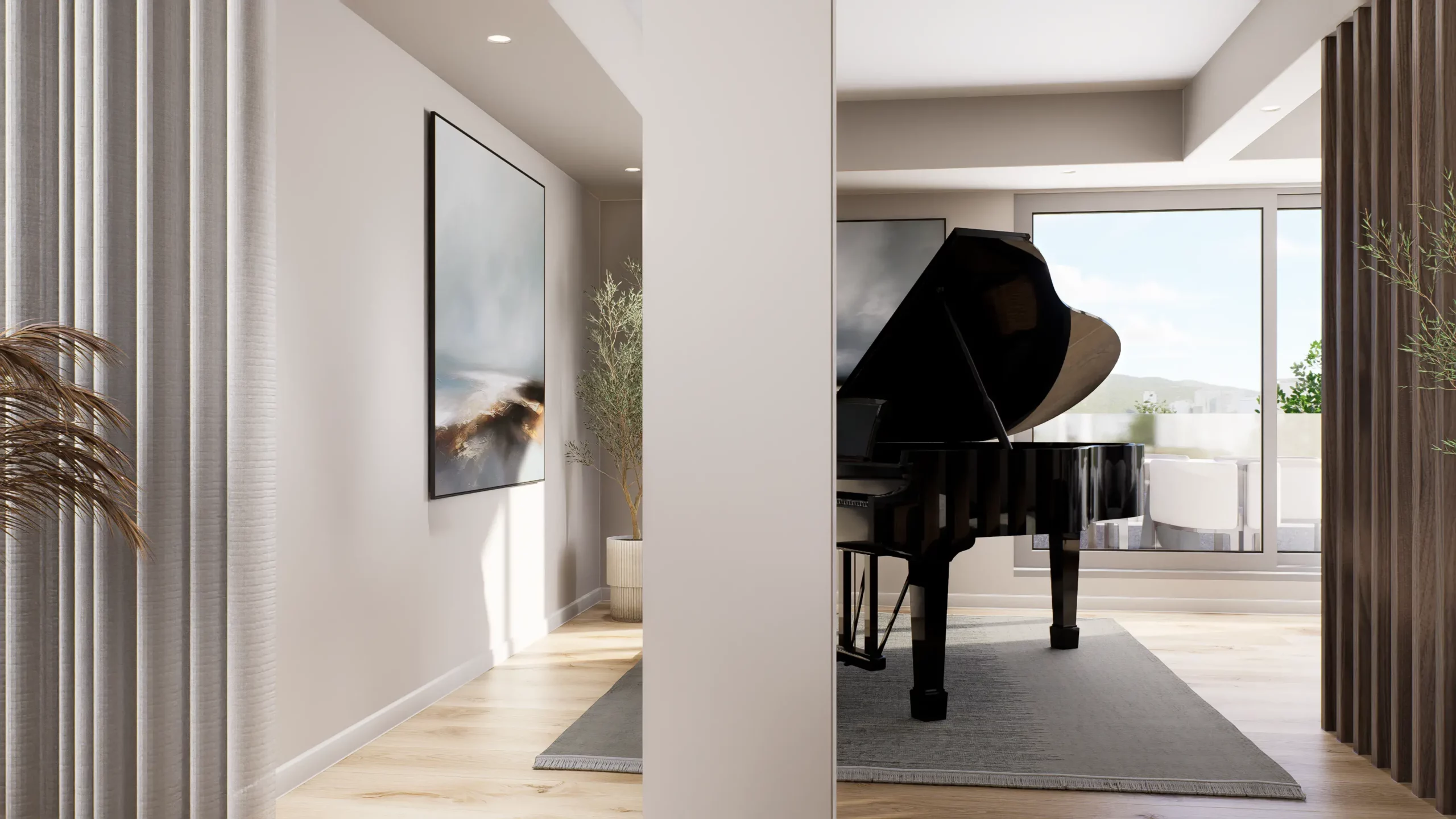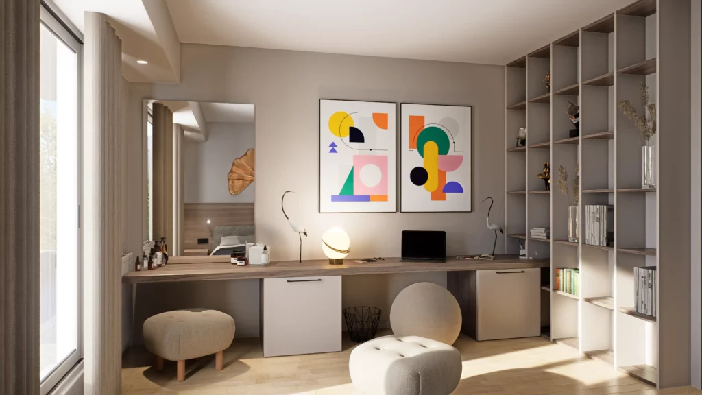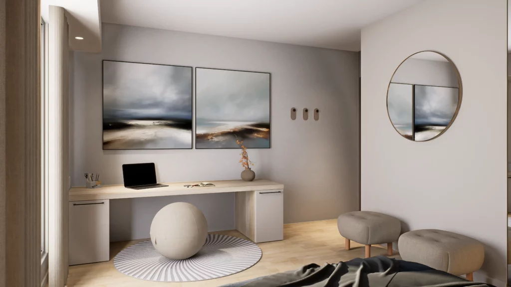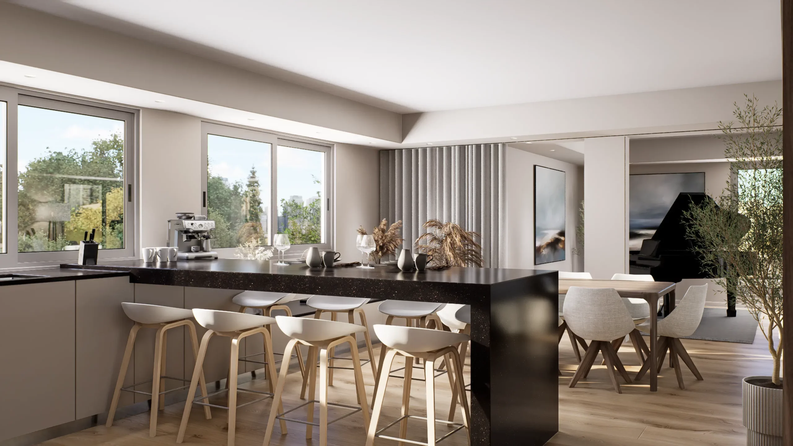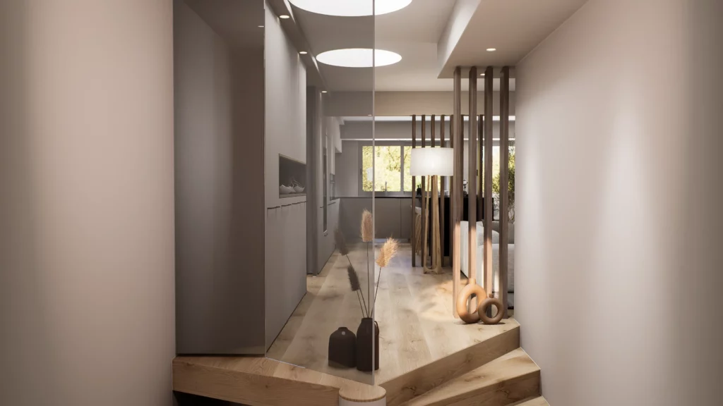 La pièce de vie, cœur du projet, s’organise autour de l’intégration d’un piano, élément central de la décoration et de la convivialité de l’espace. L’ambiance contemporaine se marie avec des touches boisées, apportant chaleur et équilibre à l’ensemble. Cuisine, salle à manger et salon dialoguent dans une continuité fluide, pensée pour la fonctionnalité autant que pour l’esthétique.