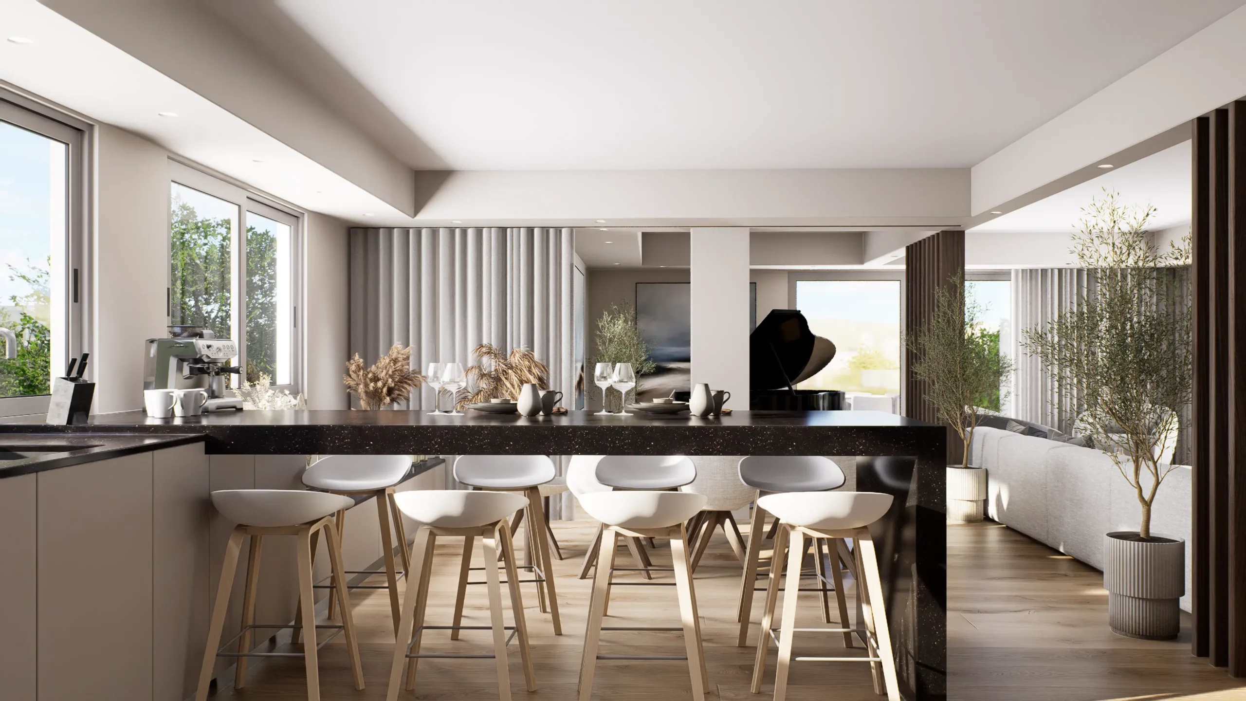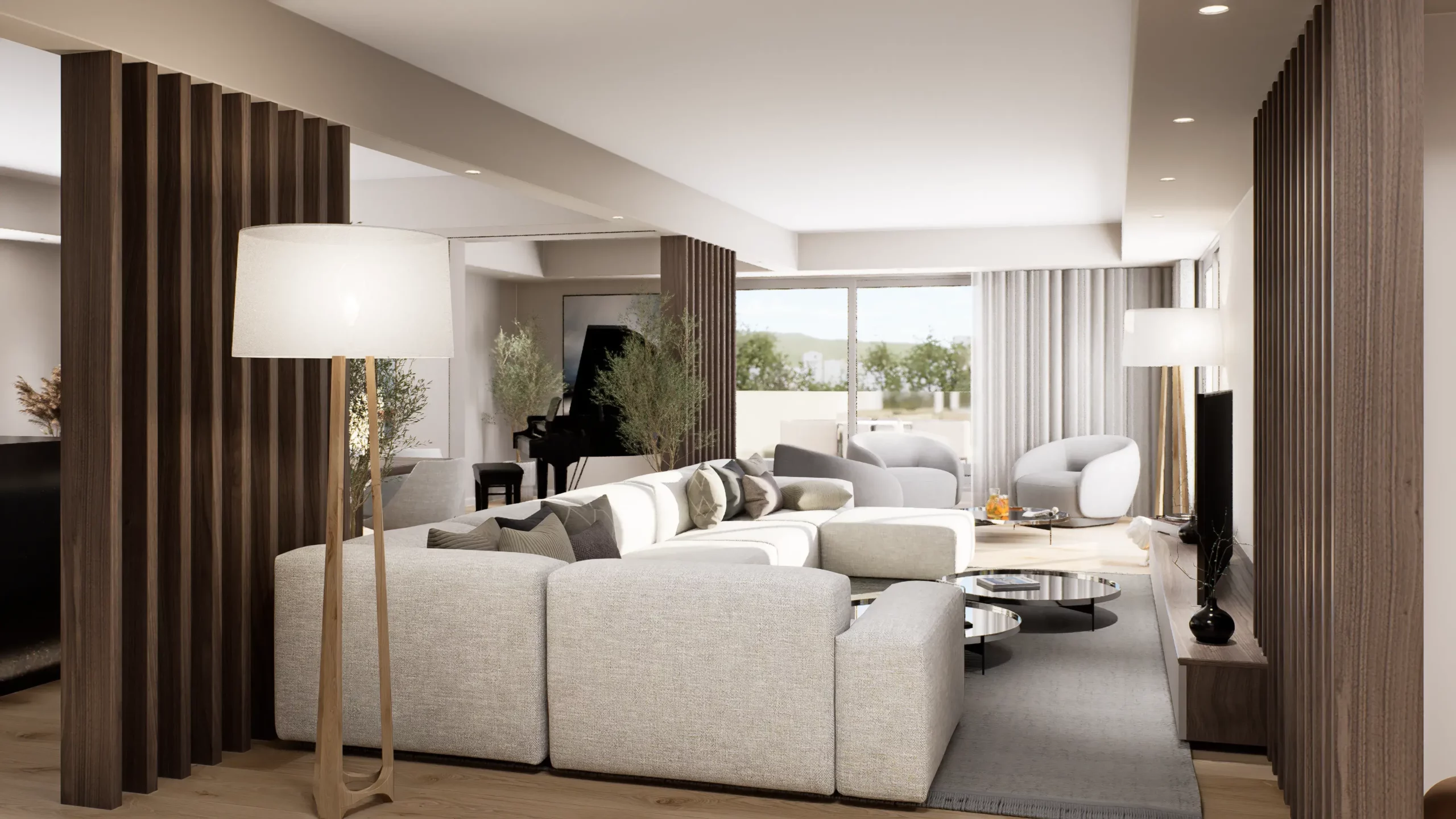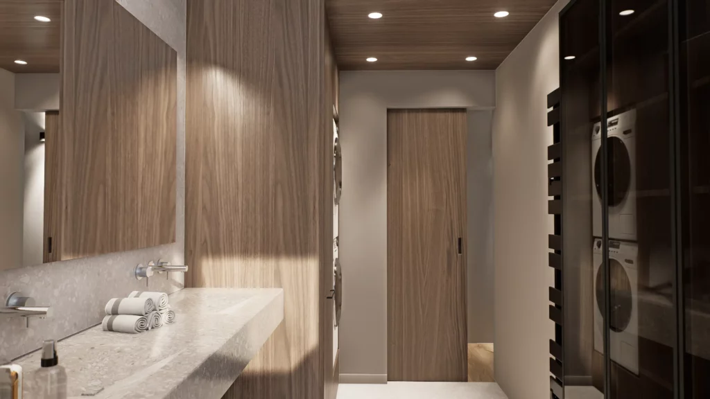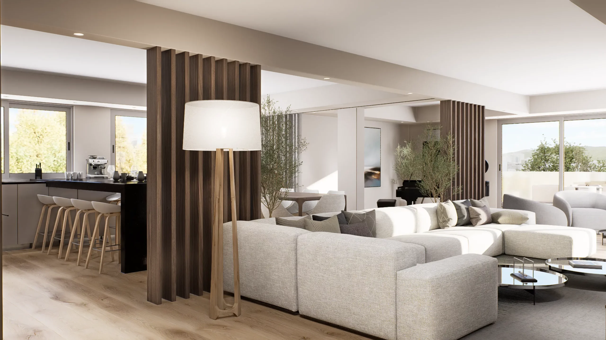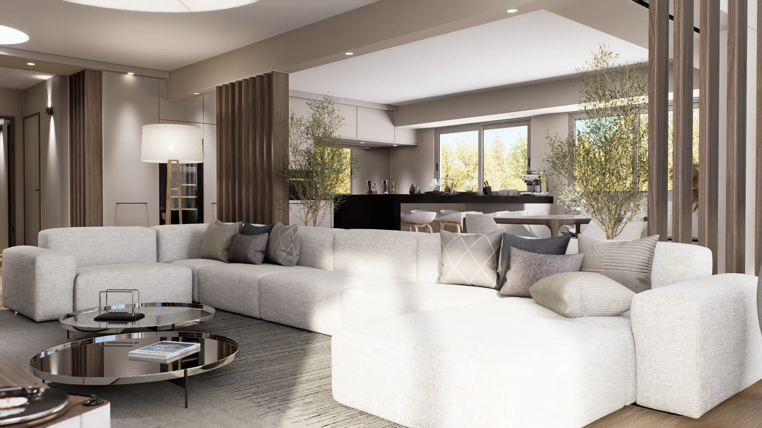 La pièce de vie, cœur du projet, s’organise autour de l’intégration d’un piano, élément central de la décoration et de la convivialité de l’espace. L’ambiance contemporaine se marie avec des touches boisées, apportant chaleur et équilibre à l’ensemble. Cuisine, salle à manger et salon dialoguent dans une continuité fluide, pensée pour la fonctionnalité autant que pour l’esthétique.