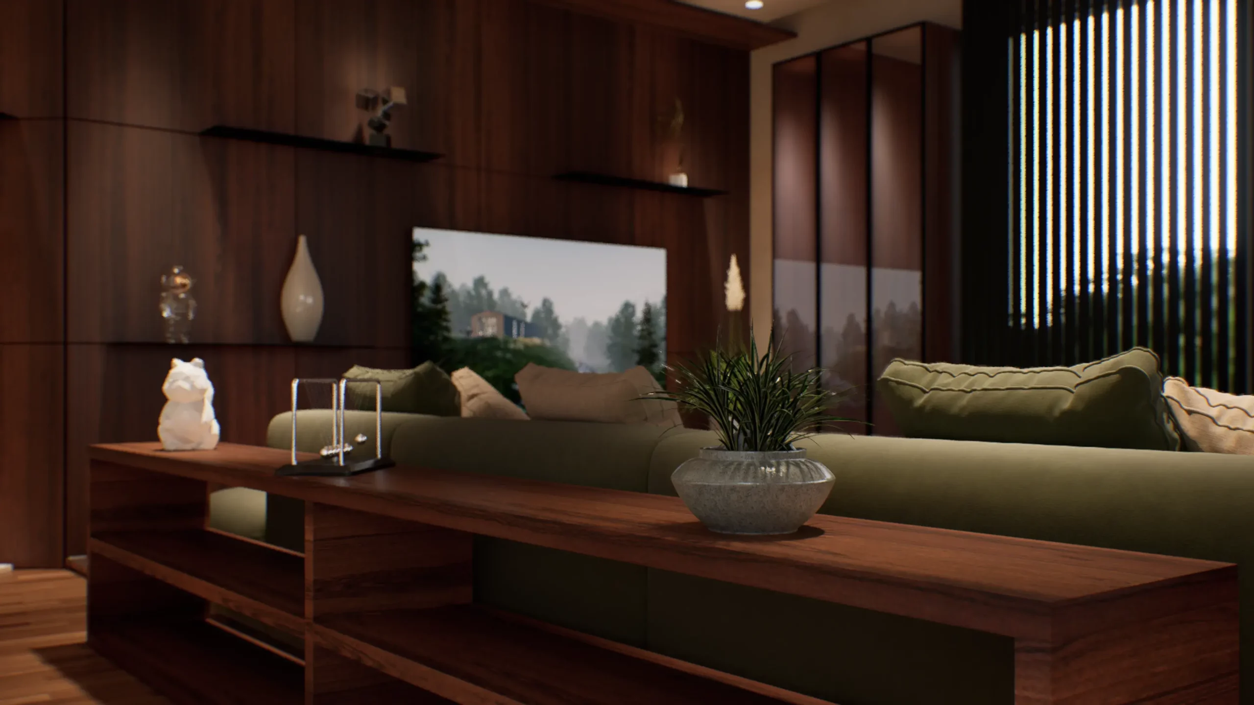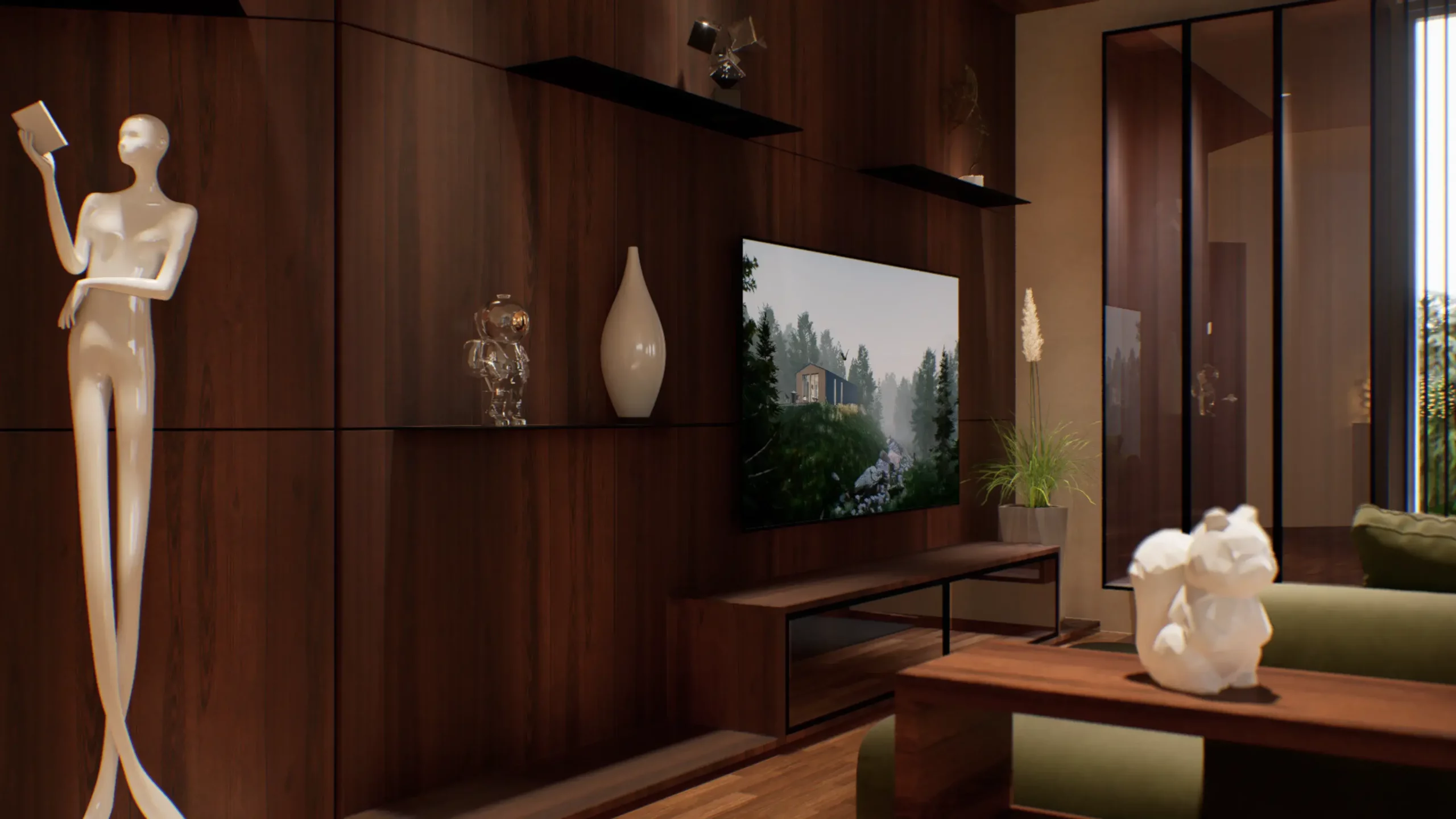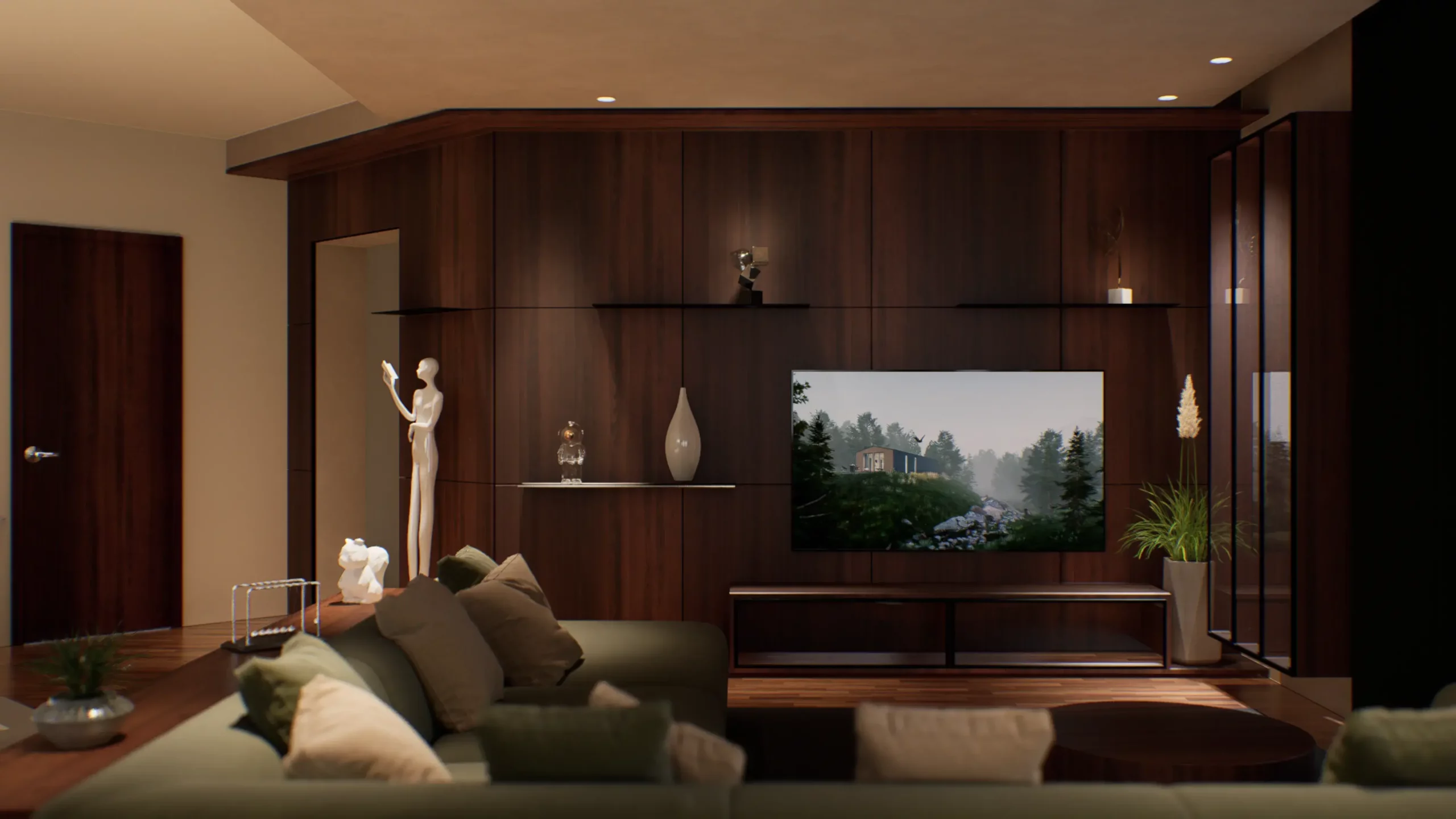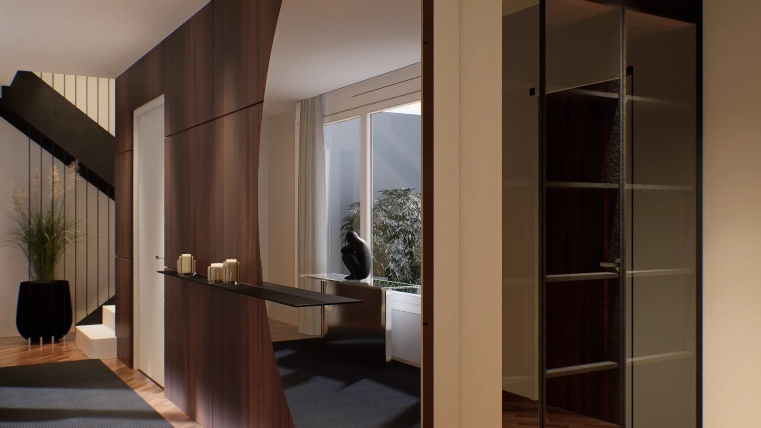 La cuisine, véritable pièce maîtresse du projet, s’élance en version suspendue, avec l’intégration de deux cavavins, d’un réfrigérateur américain et d’un vaste plan de travail. Dans sa continuité, un meuble sur-mesure relie les fonctions : meuble TV avec cheminée à vapeur d’eau intégrée, rangements dissimulés pour l’espace séjour, et éléments en hauteur habilement pensés pour optimiser les volumes sans alourdir la lecture de l’espace.